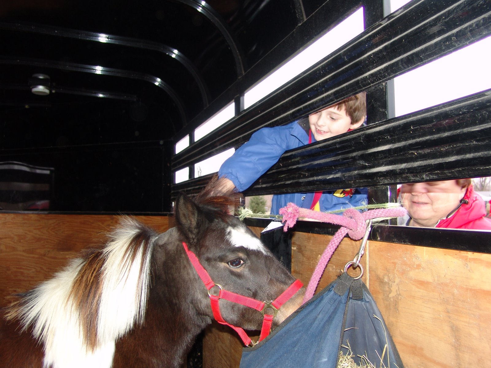 The surprise Grandpa had for Ryan was to get to see a miniature horse up close and personal!! The Lebanon Horse Parade was yesterday too, my Dad works with a guy who is in it each year. he said if we came by after the parade Ryan could play with his horse. When we got to the horse Dave, my dad's friend, wasn't there yet. So Ryan climbed up on the trailer and pet and fed the horse through the rails. He was thrilled with this much contact. We told him to be careful it may bite him, he just looked us like we were crazy and said horses are nice and in his hand went. We also took pictures of Ryan in the covered wagon while we waited for Dave to get there...then he finally got there...